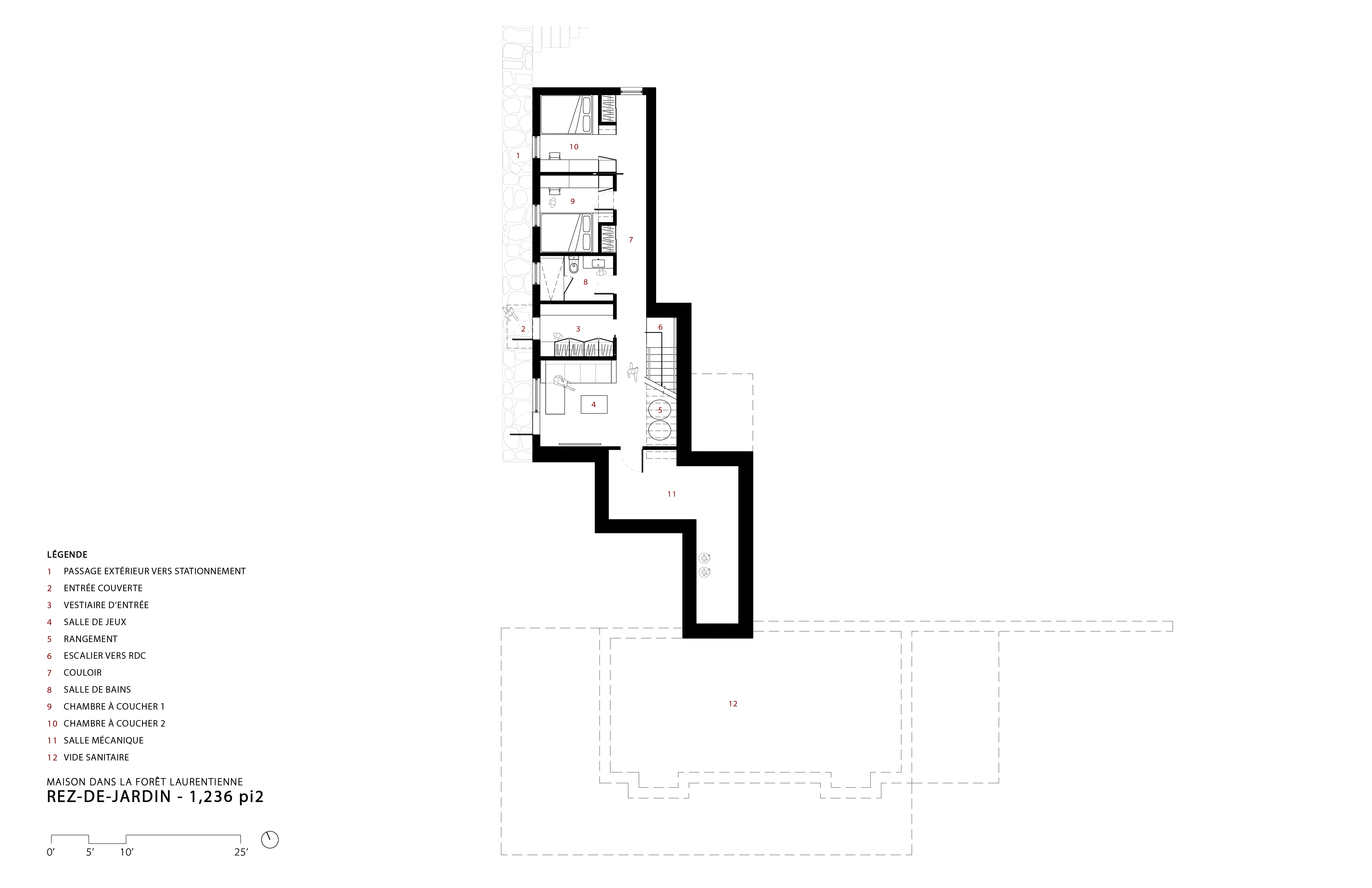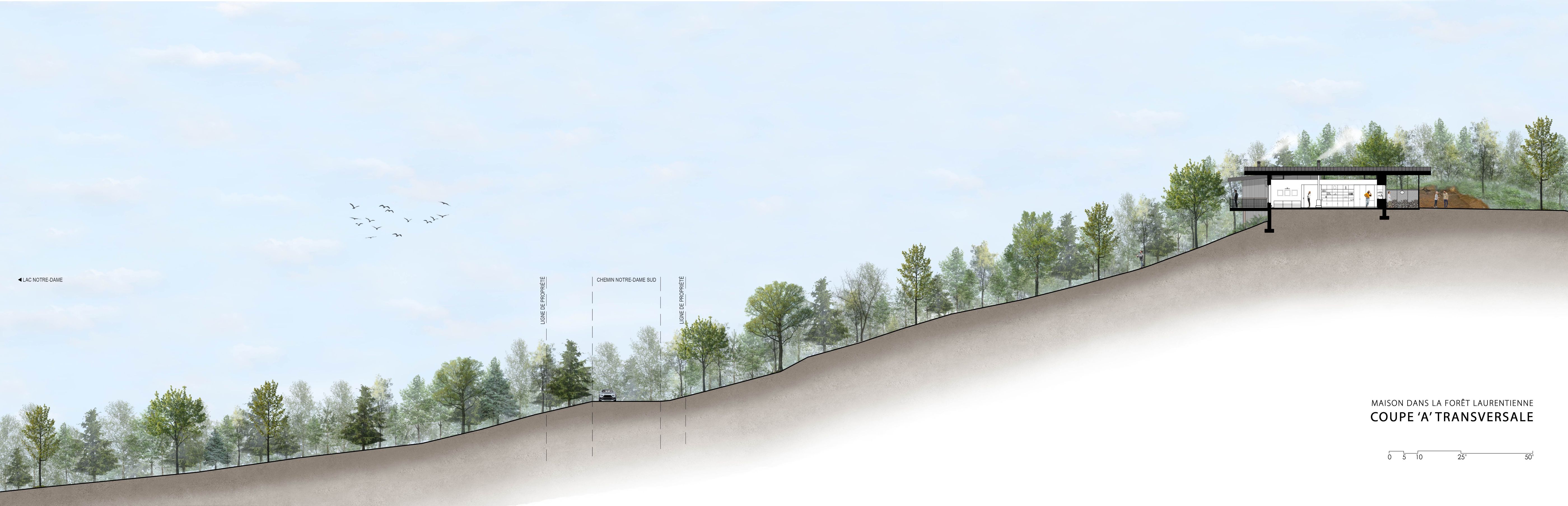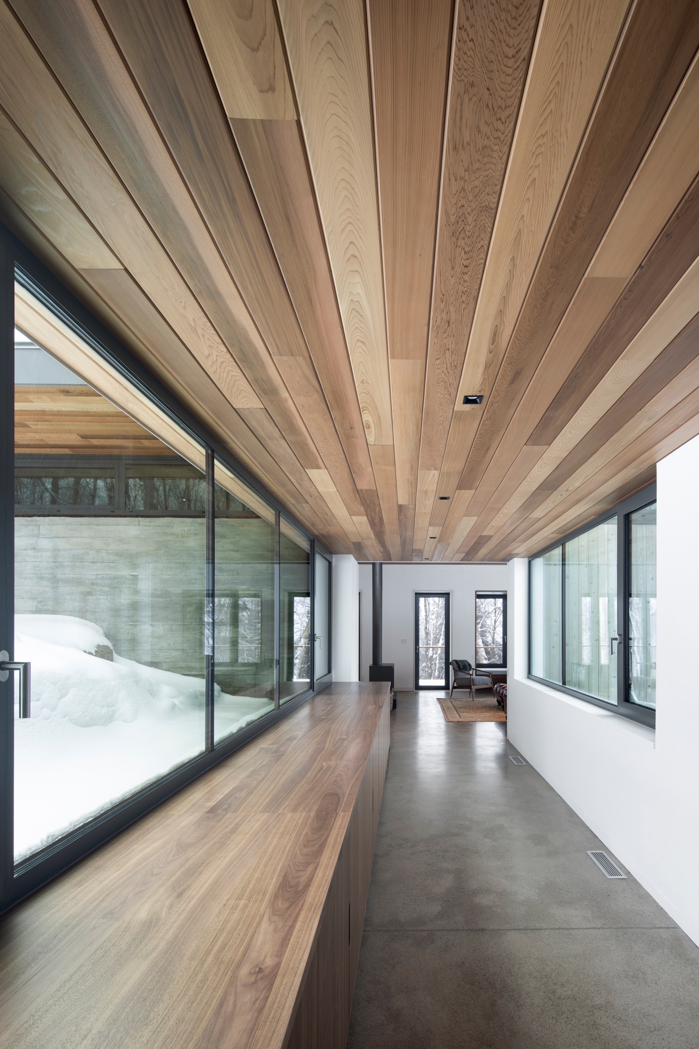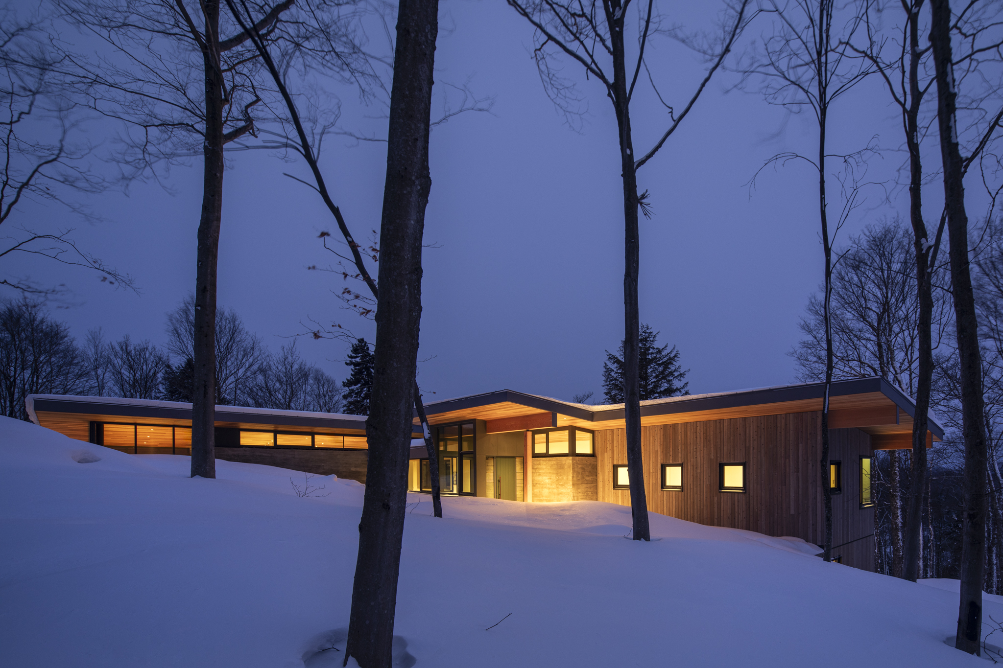 Set within a dense forest of maple, spruce, birch, hemlock, and beech, the L-shaped house is carefully nestled into the hillside. Its siting preserves mature trees while maintaining expansive views toward Lac Notre-Dame and the surrounding Laurentian mountains. Each room opens onto the forest, creating a quiet, contemplative retreat that feels deeply rooted in its environment.