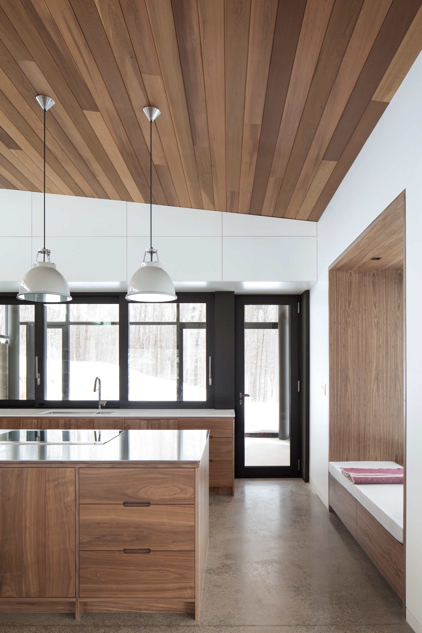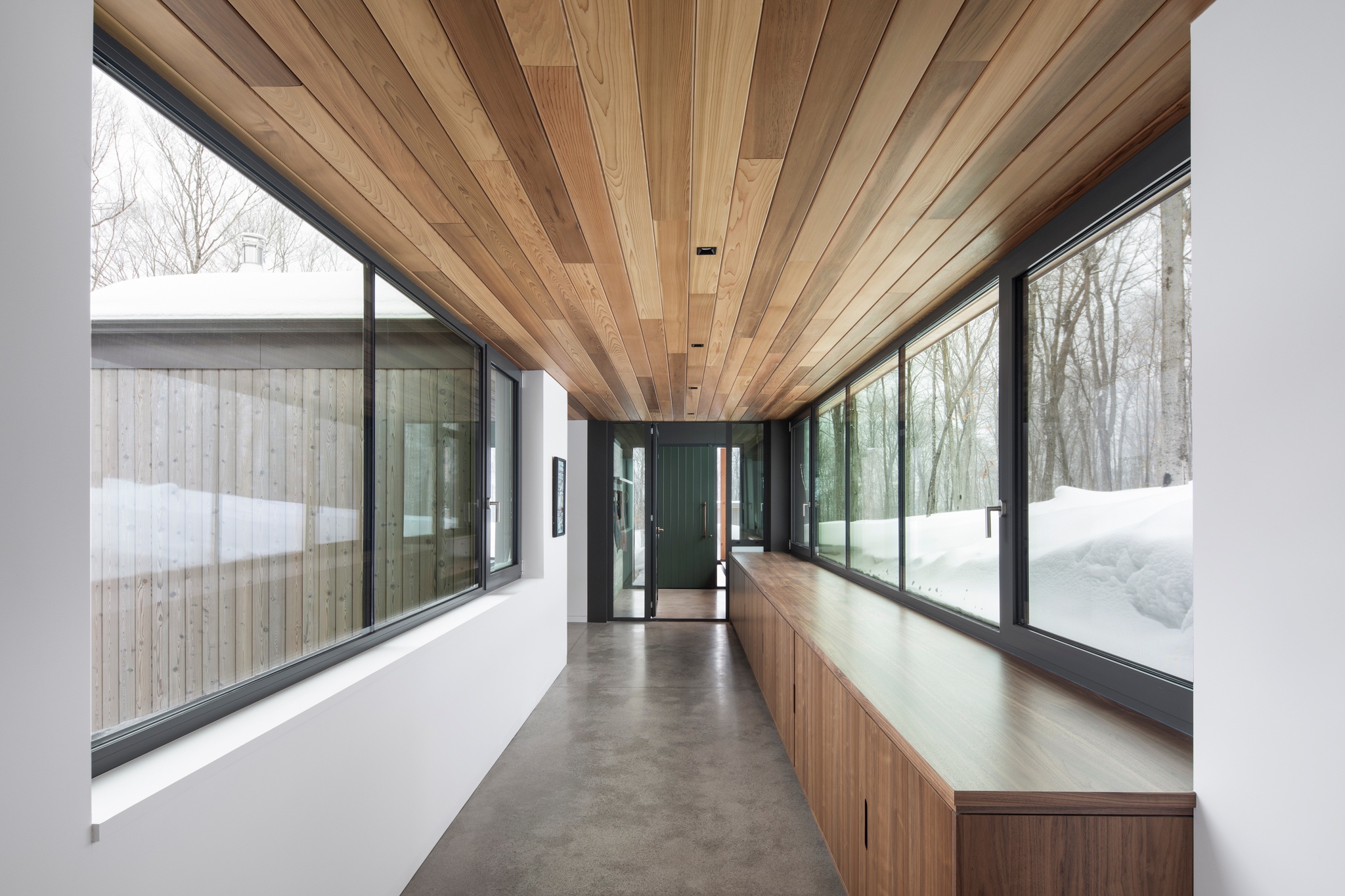 The building envelope was designed for high performance and longevity. Details were carefully considered to avoid thermal bridging. The envelope exceeds Québec’s energy code requirements, incorporating low-VOC spray foam on the interior wall and ceiling surfaces and mineral wool cavity insulation on the exterior of vertical sheathing to achieve an R-63 roof assembly and R-47 exterior walls. Triple-glazed windows are used throughout to enhance thermal efficiency and occupant comfort.