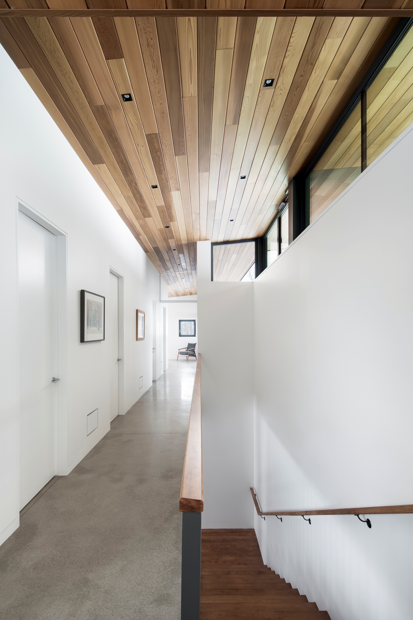 Passive design strategies inform the home’s heating and cooling strategies. Operable clerestory windows and extensive glazing enable natural ventilation and allow heat to escape during warmer months, while motorized blinds help regulate solar gain. An electric ground-source heat pump, paired with radiant concrete floor heating, provides efficient, low-carbon comfort. All mechanical systems are fully electric, allowing for a future transition to on-site renewable energy.